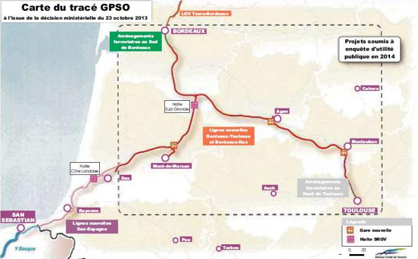 Dans ce contexte, Frédéric Cuvillier a pris ce jour une décision fondamentale pour le Grand projet ferroviaire du sud-ouest (GPSO), constituée des lignes nouvelles entre Bordeaux et Toulouse, d’une part, et Bordeaux et la frontière espagnole, d’autre part. Cet aménagement s’inscrit ainsi dans le prolongement de la ligne à grande vitesse Tours – Bordeaux, en cours de réalisation pour une mise en service en 2017.